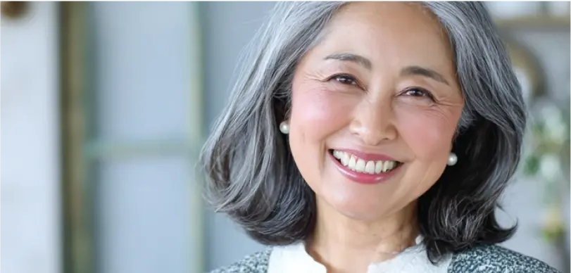 インプラントは力を骨に直接伝え、入れ歯で失われがちな咬合力を回復。噛む喜びが表情まで明るくし、 実年齢より若々しい印象へと導きます。